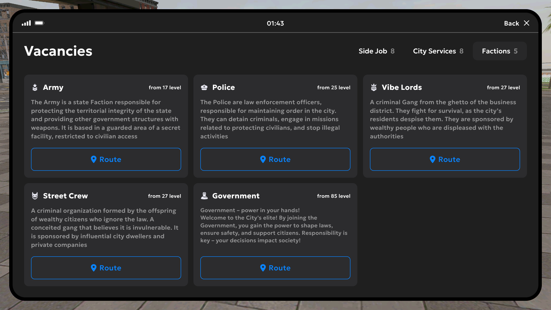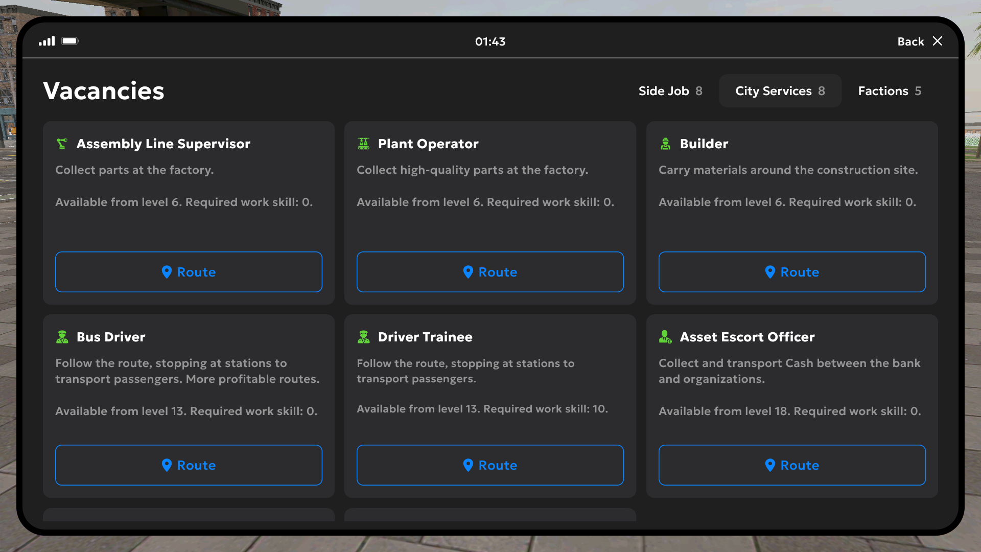 Welcome to the job application app, where every player can choose a profession they enjoy. Working on the server is not only a way to earn Cash, but also an opportunity to develop, interact with other players, and find new adventures. Here you will find job openings suitable for both beginners and experienced players