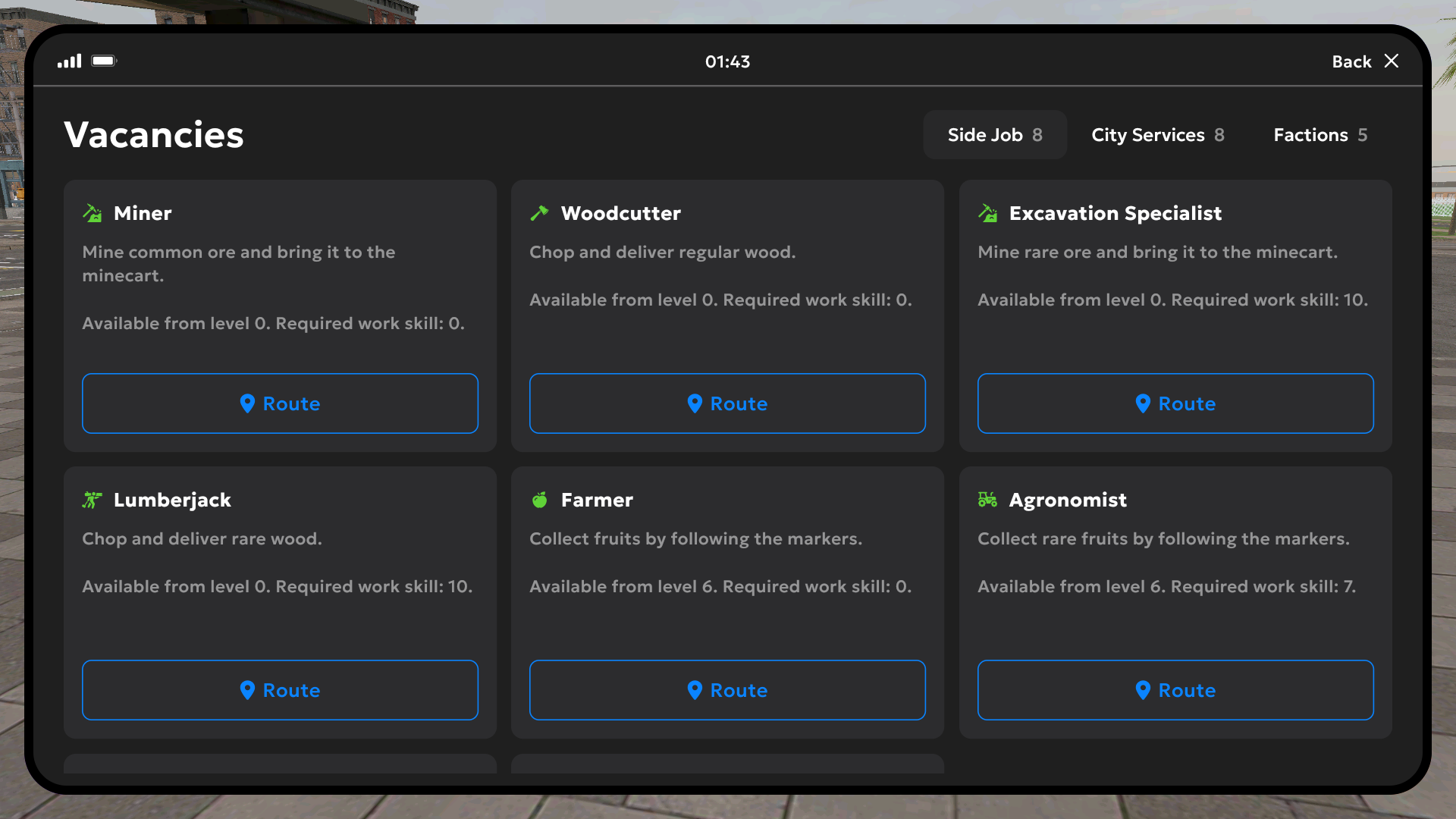 If you prefer a more independent or creative path, there are vacancies for regular jobs waiting for you. These professions allow you to earn Cash, master crafts, and interact with other players.