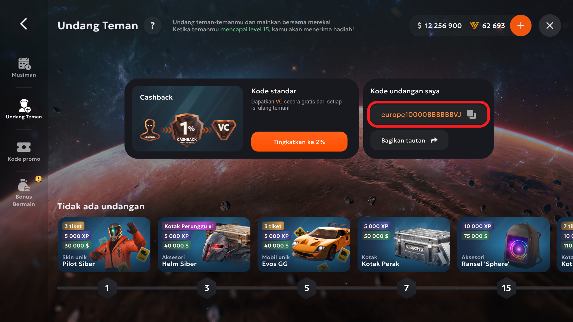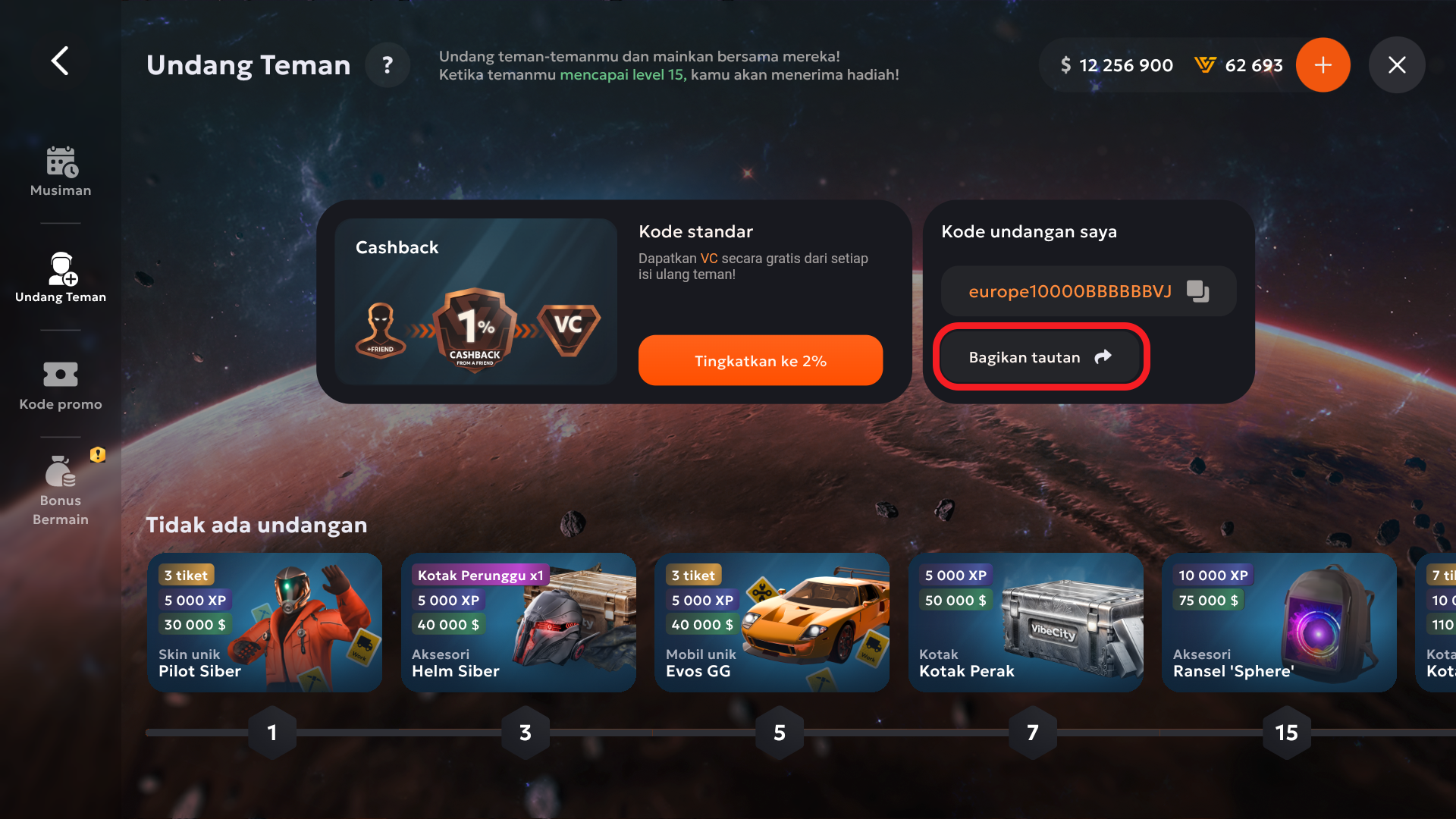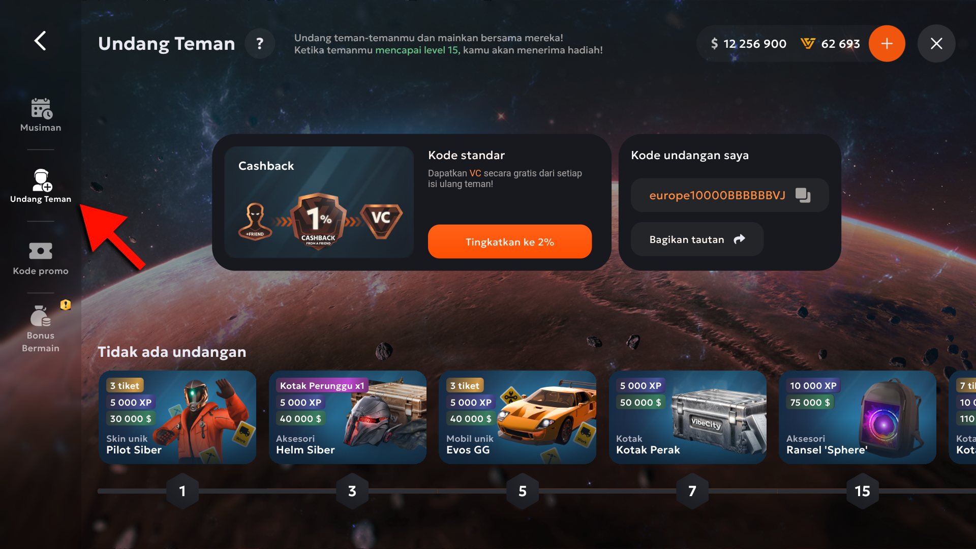Undang Teman adalah program rujukan yang memungkinkan Anda mendapatkan hadiah dengan mengundang pemain baru ke dalam permainan.