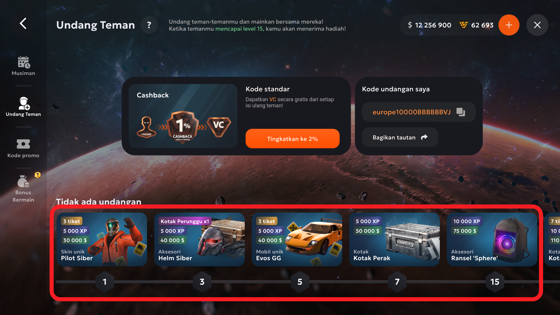 Saat pemain yang diundang mencapai level 15, Anda akan menerima hadiah. Jumlah dan jenis hadiah bergantung pada total jumlah pemain yang diundang. Daftar lengkap tersedia di menu “Undang Teman”
