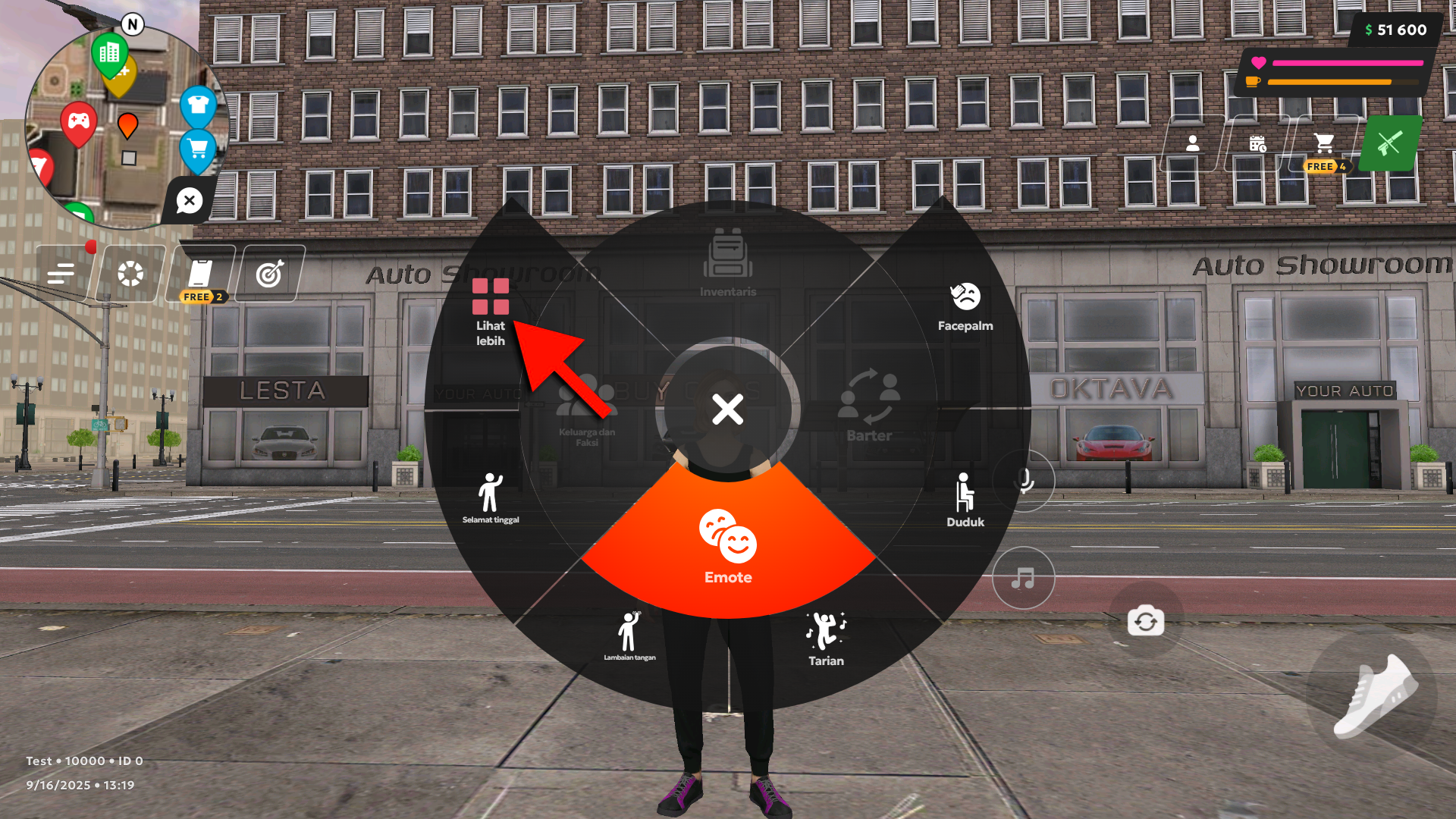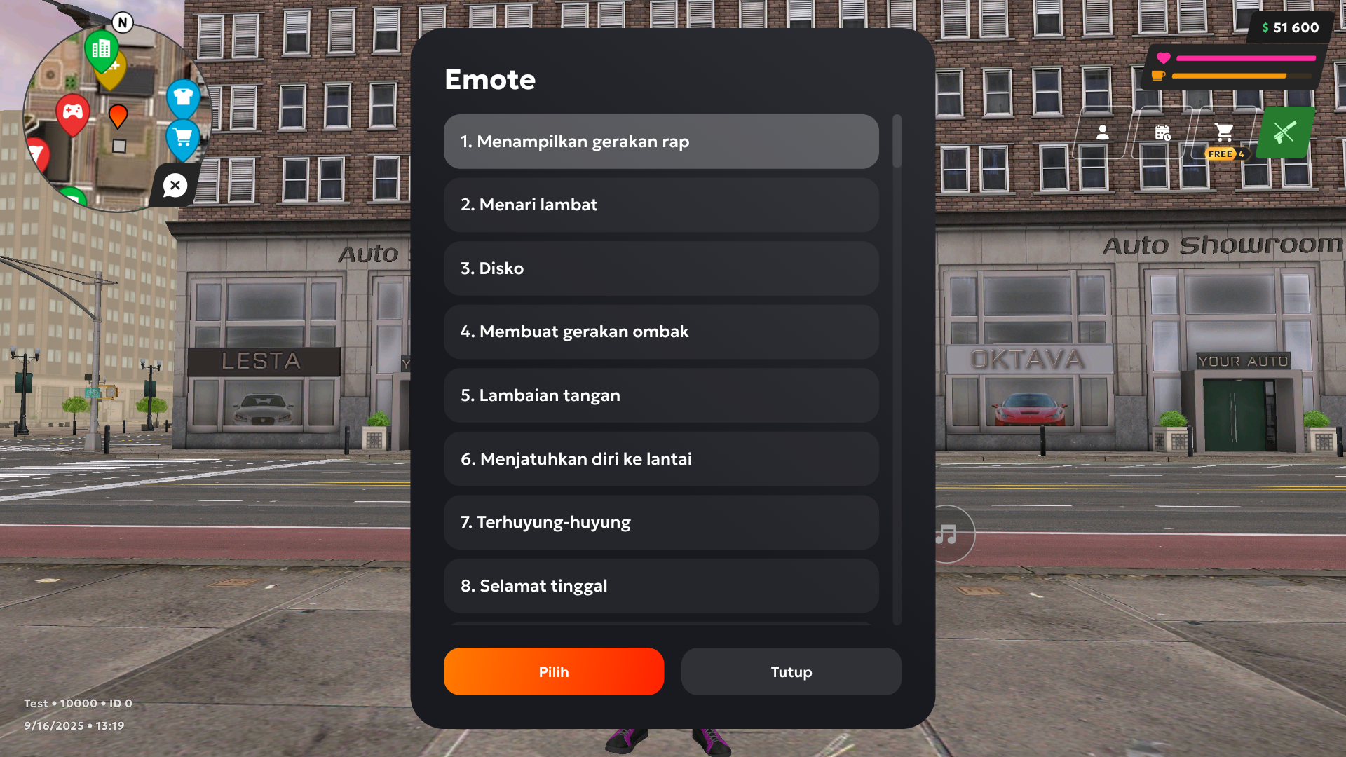 Menu menampilkan 5 emote bawaan (Facepalm, Duduk, Tarian, Lambaian tangan, Selamat tinggal).