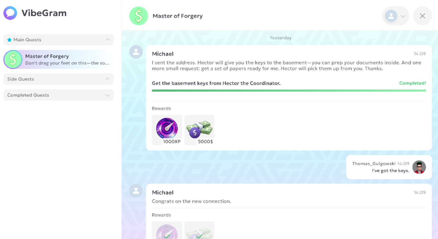 Kenalan dengan VibeGram — messenger di dalam game tempat kamu akan menerima panggilan, mendapatkan quest, chat dengan karakter, dan mengklaim hadiah. Ini adalah pendamping utamamu sepanjang permainan.