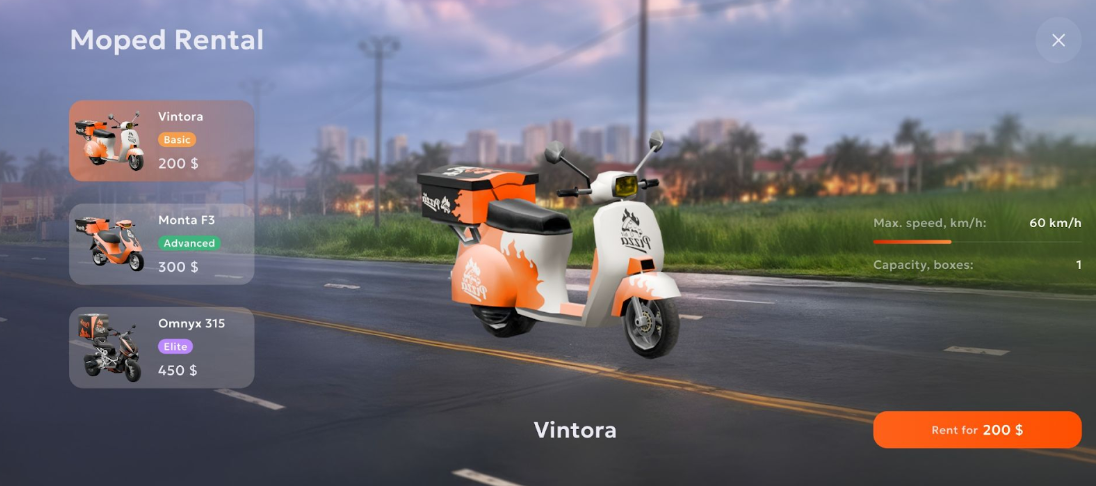 Kurir — kamu melaju keliling kota dengan moped, menyelesaikan banyak pengantaran singkat.